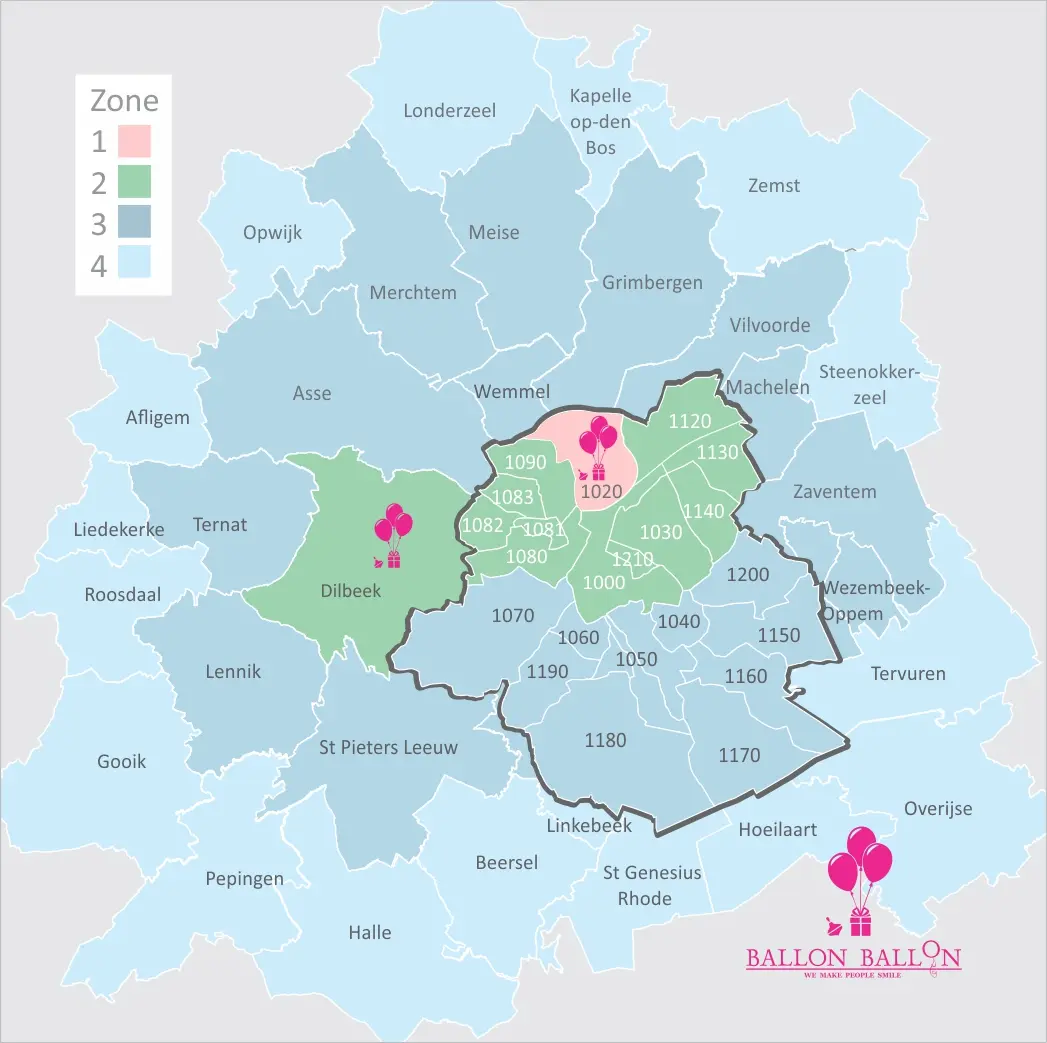 Bruxelles 19 communes, St Pieters Leeuw, Lennik, Ternat, Dilbeek, Asse, Merchtem, Wemmel, Meise, Grimbergen, Vilvoorde, Machelen, Zaventem & Wezembeek-Oppem.