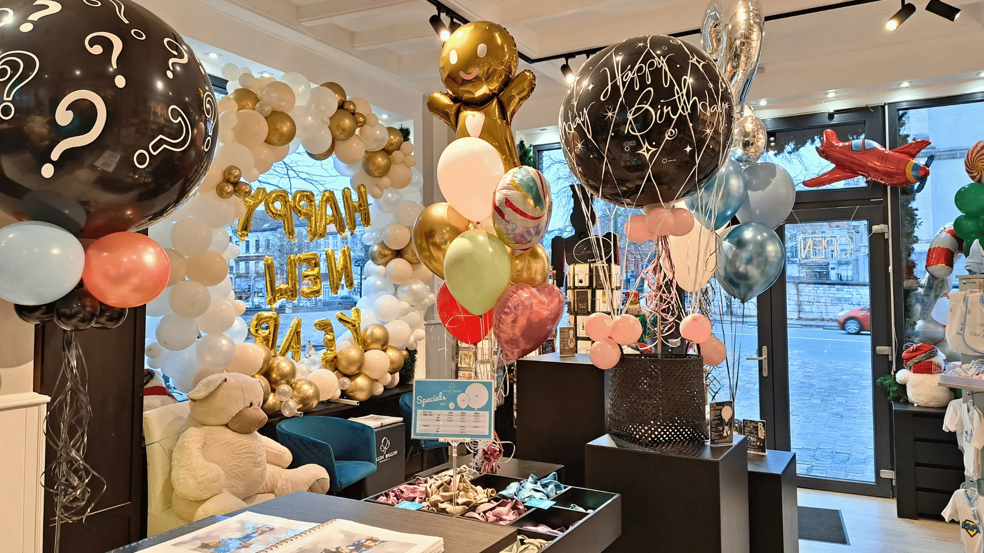 Au magasin BallonBallon de Bruxelles, situé en face du parvis de l'église Notre Dame de Laeken, vous trouverez non seulement le plus grand choix en ballons pour célébrer vos plus beaux moments de fête mais également une collection de cadeaux, coffrets et autres articles de décoration de qualité qui plairont au plus grand nombre ! Nos décorateurs sont là pour vous proposer nos plus belles réalisations, sur mesure. Parking aisé.